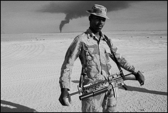10. Февраль 1991, Кувейт - - - февраль 1991: американский солдат стоит в пустыне на фоне горящей нефтяной вышки.