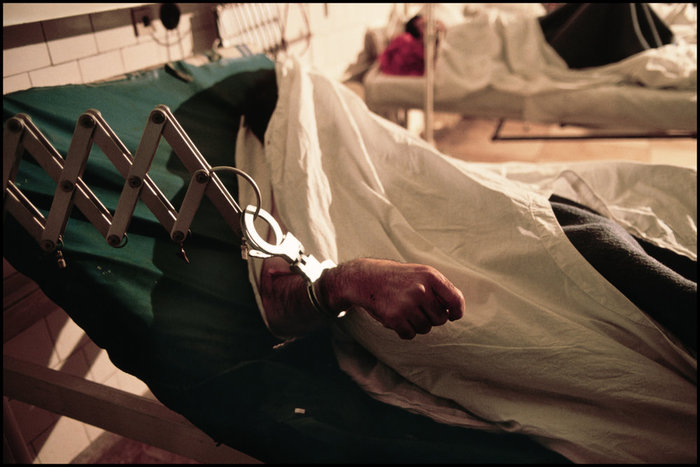 21. 1989, Бухарест, Румыния. Румынский тайный полицейский, печально известной Securitatae (Департамент госбезопасности Румынии), лежит в больнице, все еще прикованный наручниками к кровати