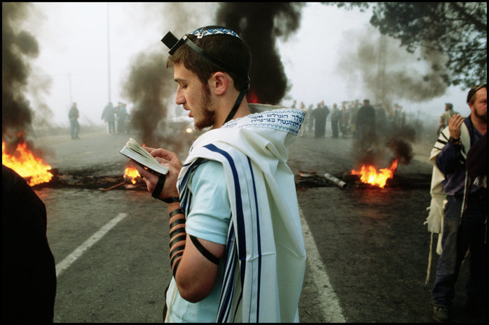 17. 1993, Западный берег - - - идя мимо пламени на улице, ортодоксальный еврейский поселенец, молится во время утренней демонстрации на Западном берегу р. Иордан