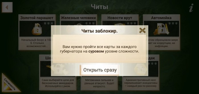 Чтобы открыть читы нужно пройти ВСЕ карты за КАЖДОГО губернатора на СУРОВОМ уровне сложности. Да я за одного-то с трудом прошел!