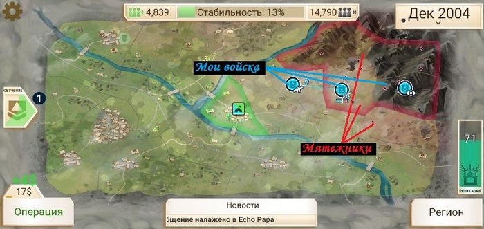 Но на "среднем" меня быстро раскатали мятежники. Я попробовал ещё пару раз, а результат тот же: красненькие точечки (мятежники) устраивают хороводы по моим территориям, репутация быстро скатывается к нулю…