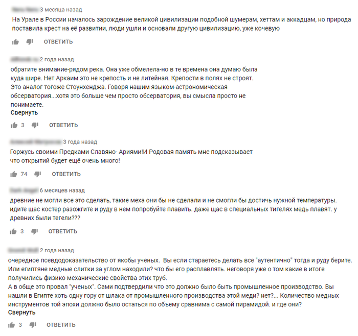 Их условно можно разделить на две магистральные темы, которые друг другу противоречат, но людей это не останавливает. Первая тема, это когда превозносят технологические возможности этих людей, объявляют их какими-то своими древними суперпрогрессивными славяно-арийскими предками, которые буквально на космических кораблях летали, а Аркаим — это база посадки этих виманов, этих кораблей. И вообще владели супертехнологиями, естественно, всё лазерами выжигали, прожигали, шлифовали. А вторая сторона обратная, когда у людей отсутствует представление об этой очень важной и определяющей для нашего общества, для цивилизации эпохе, о бронзовом веке. И люди думают, что бронзовый век — это такое время примитивных существ, которые, конечно же, не могли сделать такие прекрасные вещи, не могли сделать такую металлопластику, такое литьё, такие шлифованные каменные предметы, и вообще ничего не могли, поэтому всё это было сделано каким-то внеземным вмешательством с помощью сверхтехнологий.