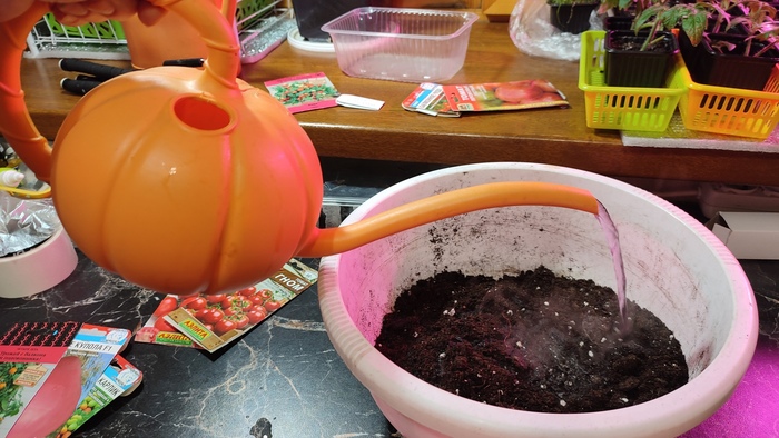 Чтобы обеззаразить грунт, стоит пролить розовым раствором марганцовки в крутом кипятке (главное, не расплавить тазик). Особенно это актуально для огородной земли. Важно: не перемочить грунт, он должен быть влажным и рыхлым, но не мокрым и слипающимся в ком (если переборщили, оставьте просушиться), иначе семечко может и подгнить. Поэтому льем сверху из лейки струйкой, перемешиваем, льем еще. Кстати, перлит и зола – штука пыльная, поэтому я поступаю с ними, как с тестом: в грунте рою ямку, высыпаю все это пыльное в центр, прикрываю сверху грунтом. Потом, когда проливаешь первый раз, надо аккуратно перемешать – и пыли вокруг и в легких будет не так много.