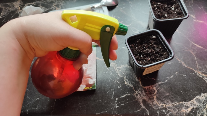 Можно, если у вас земля получилась не сильно влажной, либо на следующий день, либо сразу чуть-чуть побрызгать из пшикалки (тем же раствором марганцовки - чего добру пропадать, или просто водой). Больше поливать не надо, у них там в тепличке образуется своя тусовка с конденсатом (и шлюхами). Закрываем плошку крышкой (с небольшой вентиляцией) или пищевой пленкой, а стакашек можно, например, поставить в целлофановый пакетик и завязать. Ставим в теплое место (23-25 градусов нужно для прорастания), ждем дня три-четыре до первых всходов. Можно танцевать вокруг с бубном и проверять раз по 20 на дню, но раньше они не взойдут, если их предварительно не проращивать (я пока эту технику не пользовала).