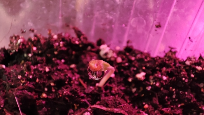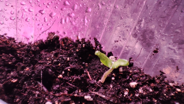 И вот тут, если томат не заглублен достаточно, может получиться так, что в процессе прорастания семечко не успеет сбросить семенную оболочку, – и взойдет у вас голова на стебельке. Бояться не надо, руками трогать тоже (поверьте криворукому мастеру, повредить семядольные листочки самые первые крайне легко и руками, и пинцетом, если пытаться стаскивать этот шлем). Короче, мы берем пипетку или любой другой предмет, способный капельку воды собрать на себя – и вешаем эту капельку на шлем, он размягчается, листочки раскрываются, все счастливы. Повторить несколько раз при необходимости, но не залить малявку.