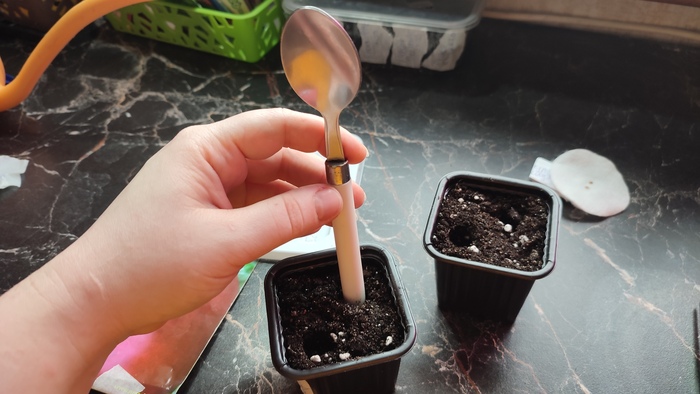 Дальше все просто, но есть пара нюансов: наполняем горшочки грунтом и немного притаптываем – не трамбуем кулаком, а нежно-нежно прижимаем и выравниваем. Это нужно, чтобы семечку не утянуло при поливе глубже, чем надо. Потом цилиндрическим предметом – ручкой, черенком ложки, да хоть пальцем, заглубляем ямку на сантиметр (чуть больше можно до полутора – меньше нельзя, потом скажу, почему), ласково укладываем семечко, закрываем землей сверху и желаем ему скорейшего прорастания.