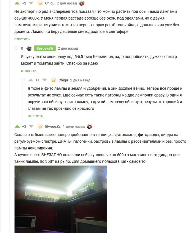 И еще про лампы: по моему опыту они НЕ ДОЛЖНЫ гореть денно и нощно. Вспомните про фотосинтез из школьного курса биологии – растюхам тоже надо отдохнуть в темноте, чтобы завершить все начатые процессы. Если коротко: в январе-феврале светим часов по 12 в сутки, в марте и дальше, если солнечно днем, то лампу надо включать на закате, часов после 16-17 и часов до 22:00 (в зависимости от вашего личного цикла – можно выключать и раньше).