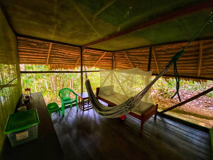 В хижине было всё самое необходимое для комфортного пребывания: кровать с противомоскитной сеткой, стол, пара стульев, гамак, пакеты для личных вещей (в джунглях круглый год жарко и влажно), питьевая вода, свечи, фонарик. Реально, мне больше ничего не потребовалось за всё время диеты. Хижина просторная и очень уютная, с первого и до крайнего дня мне было комфортно в ней находиться. По всему периметру были протянуты верёвки и висели шторы, которые при желании или необходимости можно было закрыть, чтобы отгородиться от внешнего мира и побыть наедине с собой.