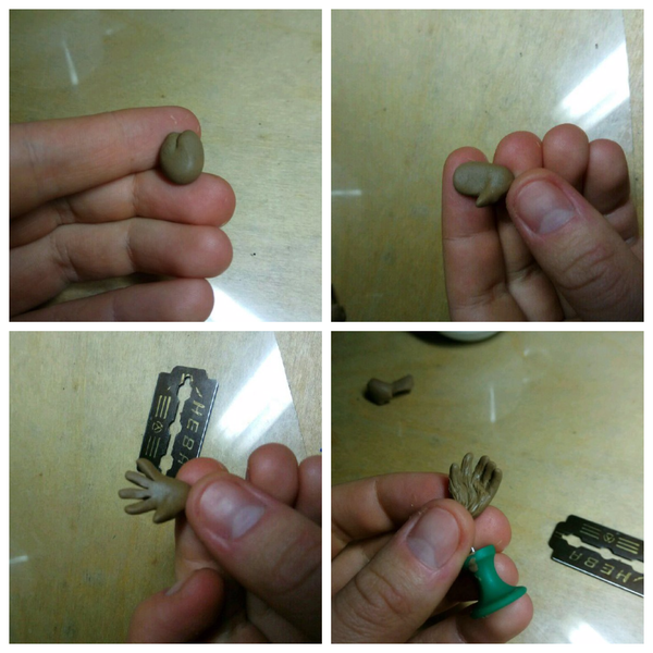 Следующий шаг руки. Тут уже дело каждого, кому как удобно. Я делаю два примерно одинаковых комочка, леплю варежки, лезвием отделяю пальцы и иголкой прорабатываю каждый из них.