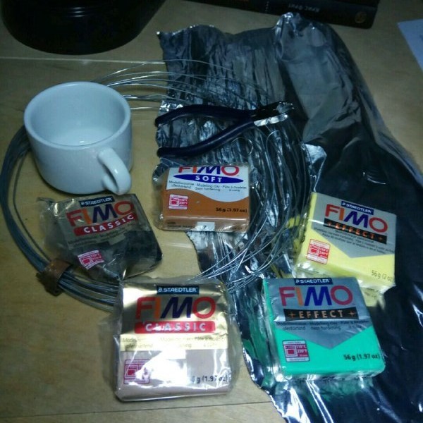 Итак, нам понадобиться: металлическая проволока, глянцевая поверхность( у меня обычное стекло), фольга для запекания, полимерная глина, акриловые краски(черная, желтая и зеленая), горшок, лезвие и иголка.
