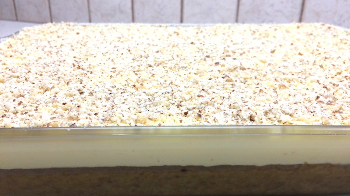Покрываем готовым кремом бисквит , и посыпаем орехами.