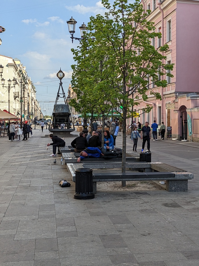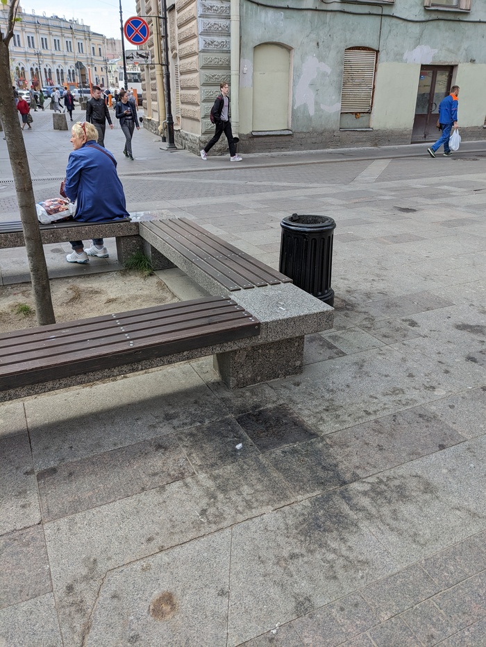 А вот одни из виновников "торжества". Примерно с этим фото у меня ассоциируется данная улица в голове. Почти всегда могут встретиться разные асоциальные элементы или маргиналы. Им по душе немного подремать заняв весь квадрат из четырех лавочек, ну или под ним, тут уж зависит от степени их нетрезвости.