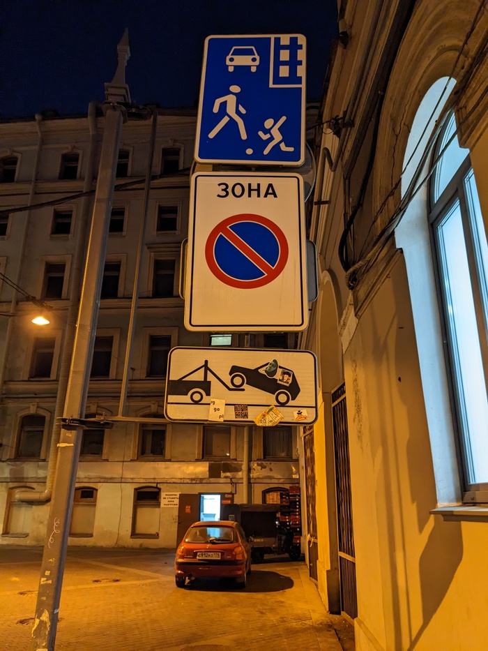 Забавно видеть такое. Судя по регулярному неисполнению указанных правил на знаках, то это просто очередная инсталляция. Въезд со стороны Орловского переулка.