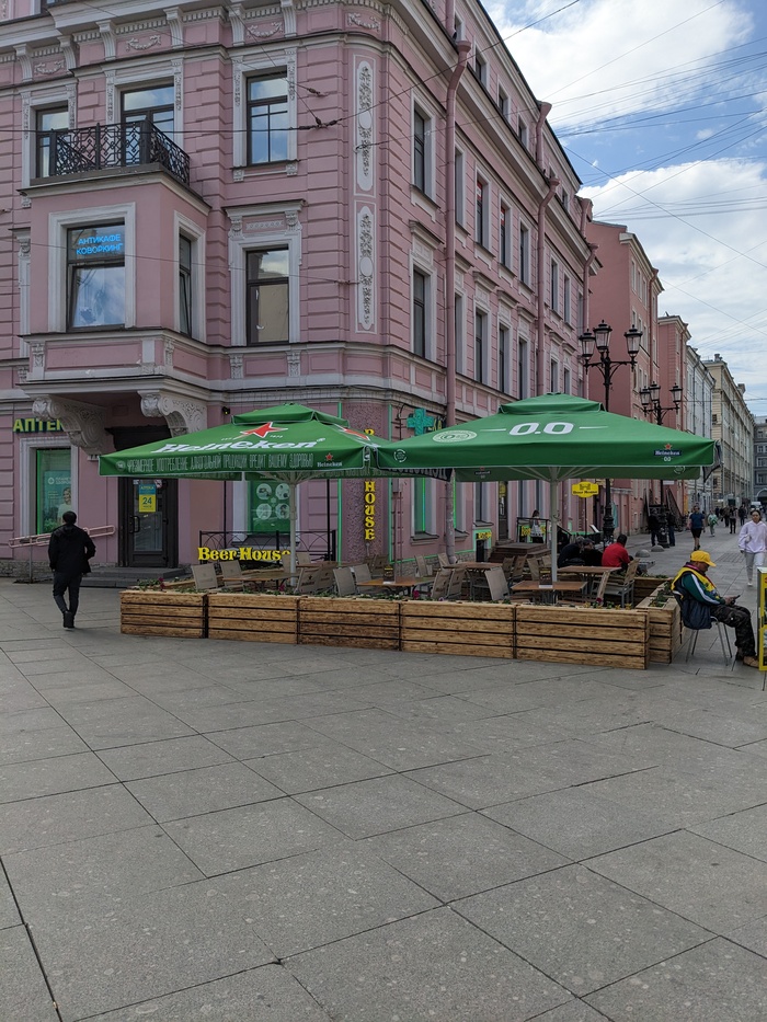 По левую и правую сторону от инсталляции можно лицезреть вот такие "симпатичные" пивные веранды. Я конечно же максимально ярый противник такого в центре города, особенно на пешеходной улице. Мое мнение, что это распитие спиртных напитков в общественном месте и никак иначе. И это одна из причин почему это худшая "пешеходная" улица в городе.
