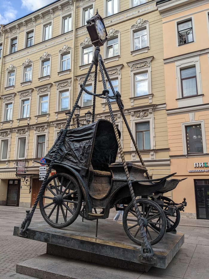 А вот и основная доминанта улицы. Это "Памятник легендарной пролётке" или просто памятник "Карета". Ну в общем какая доминанта, такая и улица. Не буду прямо говорить, что это ЖКЖ-арт, но по-моему мнению близко к таковому, очень слабая работа. Вся конструкция выполнена из металла, что делает ее бездушной и мертвой. Работа не вызывает никаких эмоций, никаких отсылок в прошлое, буквально ничего. Я считаю, что воссозданный исторический прототип из натуральных материалов смотрелся бы намного интереснее. Настоящий канат, настоящая древесина, работающая механика кареты, реальная поверхность.Только вдумайтесь, десятки тысяч людей видят этот памятник буквально каждый день, ведь это видно всем проезжающим со стороны Невском Проспекта, помимо проходящих мимо людей.