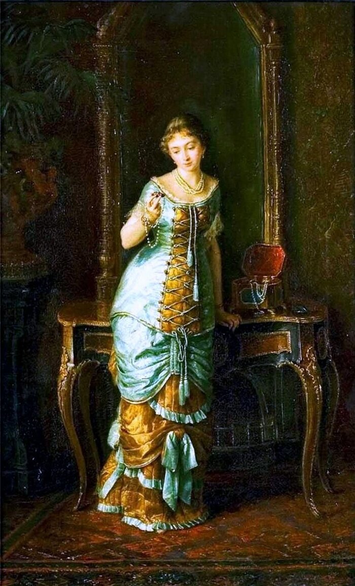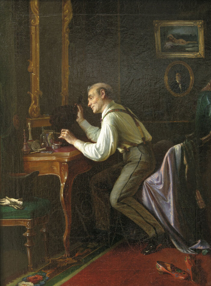 Зарисовка из жизни стареющего модника второй половины 19 века. Перед нами, скорее всего, успешный чиновник. То, что это чиновник, показывает отсутствие усов и бороды. Примечательно, что до 1880-го года им официально было запрещено носить усы и бороды, допускались только бакенбарды. Военные могли носить усы (и то не все, но многие). Зато люди, не относящиеся ни к тем, ни к другим очень часто носили и усы, и бороды. Купцы и выходцы из крестьян по привычке и традиции. А остальные просто потому что считали, что это стильно и показывает, что они не какие-нибудь чинуши. Особенно это касалось людей интеллигентных или творческих профессий. Вообще отношение к чиновникам было неоднозначное. Мелких часто не уважали из-за малых доходов, это часто можно увидеть и в литературе, и в живописи. А высокопоставленных примерно по тем же причинам, что и сейчас, но это уже другая история. То, что мужчина успешен, можно понять и по интерьеру, и многим другим деталям. Название немного иронично, туалетный столик ассоциируется у нас обычно с женщинами. Мы видим брошенный шёлковый халат, домашние туфли в восточном стиле, да ещё и с намёком на каблук. Оба предмета стоили недёшево, герой везде хочет чувствовать себя стильным человеком. Даже в тех деталях, которые окружающие обычно не видят. Например, у него симпатичные подтяжки для брюк, на которых можно рассмотреть вышивку. Рядом лежит цилиндр и светлые, скорее всего, лайковые перчатки. Такие обычно носили для утренних визитов. На туалетном столике можно рассмотреть красивые серебряные часы. А ещё маникюрные ножницы (такие небольшие плоские использовались для ногтей), щеточки для одежды, несколько больших флаконов. В них могли быть духи. В то время парфюмерия часто продавалась в розлив и не делилась на чётко мужскую и женскую. Наносили её чаще на одежду. Обычно это были моноароматы. Так что в бутылочках на столе вполне могла быть какая-нибудь «фиалковая вода» или «нежный жасмин». А ещё мы можем рассмотреть баночку со специальной помадой. Это средство для укладки волос, подкручивания усов и тд. Вот только у нашего героя усов нет, да и с волосами в прямом смысле не густо. На голову он хочет водрузить парик. Вот такая ирония.