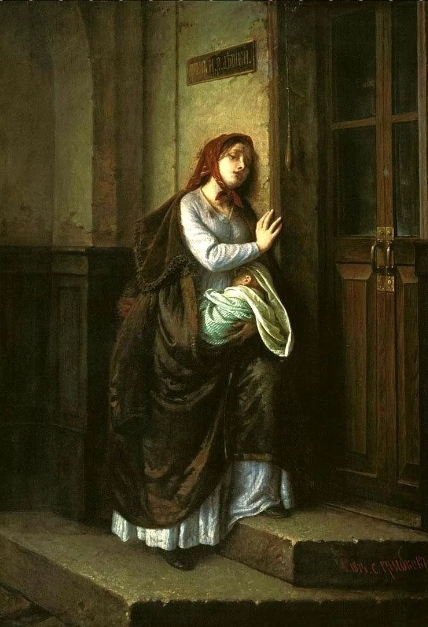 Что тут происходит, легко понять из названия. Просто добавлю всего несколько штрихов. Молодая женщина стоит на пороге мрачного здания, можно рассмотреть надпись «Приём н.р.детей». «Н. Р» - сокращение незаконно рождённых, то есть внебрачных. На женщине простое платье, поверх него похоже что салоп. В начале века это была модная одежда состоятельных женщин, ко второй половине в ней ходили мещанки, небогатые горожанки. На голове героини картины платок, они были популярны в основном у выходцев из крестьянской среды. То есть перед нами с большой долей вероятности девушка родом из деревни, работающая в городе. Здесь у неё случилась внебрачная связь. По легкомыслию, наивности, а иногда и принуждения со стороны работодателя, вариантов может быть много. Теперь нерадивому отцу судьба соблазненной им девушки не интересна, иначе вряд ли бы она осталась в столь бедственном положении. С работы вышвырнули, на новую с незаконно рождённые ребёнком не устроиться, а домой возвращаться стыдно, и не факт, что примут. Приюты для таких детей стали открываться в России в 18 веке. Они появились во многих городах, к 20 веку их было уже около тысячи. Условия в них были разные. В некоторых случаях детей сразу начинали воспитывать в приюте, в некоторых маленьких детей отдавали сначала в деревню под надзор семей, с которыми была соответствующая договорённость, а потом забирали назад для уже дальнейшего воспитания. Детская смертность в приютах была очень высока, до взрослых лет доживали по разным оценкам 10-15%.