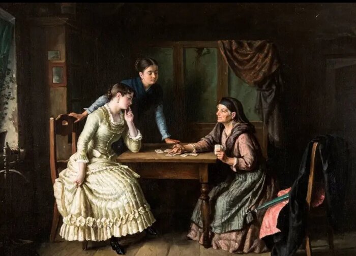 И ещё одна бытовая зарисовка. Две девушки пришли к гадалке. Надо заметить, что гадалки - явление более характерное для городов. В деревнях могли быть местные колдуны, но люди относились к ним с опаской и ходили для решения конкретных насущных проблем, часто за всякими снадобьями. Гадали обычно сами на святках разными способами. Сведения о многих святочных гаданиях дошли до наших дней. «Профессиональные» гадалки чаще встречались в городах и делились на две категории. Странствующие и «оседлые». К первым обычно относились цыгане, всякие якобы «божьи люди», юродивые и тд. Цыганки чаще гадали по рукам, среди остальных было довольно много толкователей снов, ныне забытое ремесло. В городах было больше оседлых. В 18 веке в России наиболее популярны были гадания на кофейной гуще, карты стали популярны в 19 веке. Но многие гадалки и от кофе не отказалась, они стали «универсалками». Оказывали подобные услуги почему-то чаще всего немолодые женщины крестьянского происхождения. Хотя были и из более рафинированной среды, они обычно работали с публикой побогаче. К богатым клиентам часто приходили на дом. К концу 19 века у состоятельных людей моднее были всякие спиритические сеансы, вызовы духов, столоверчение и тому подобное. Разброс доходов в этой среде был очень большой, значительная часть зарабатывала не так уж много из-за большой конкуренции. Ну а в данном случае мы видим двух девушек, пришедших к самой типичной гадалке того времени, уже не молодой, судя по бедноватому интерьеру, не особо богатой и успешной, а судя по одежде и прялке в доме, деревенского происхождения.