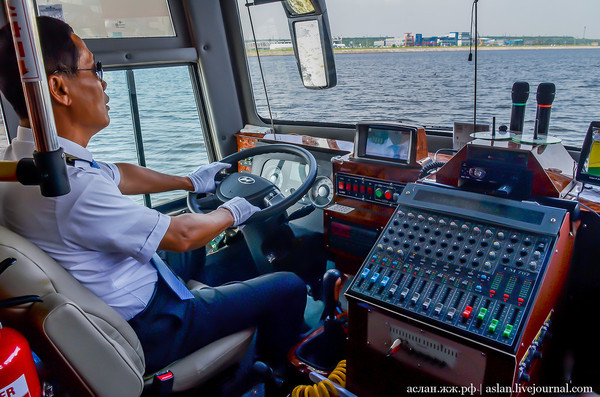 А вот и тот самый аквабас. Автобус, способный держаться на воде, и даже плыть по воде, как катер.