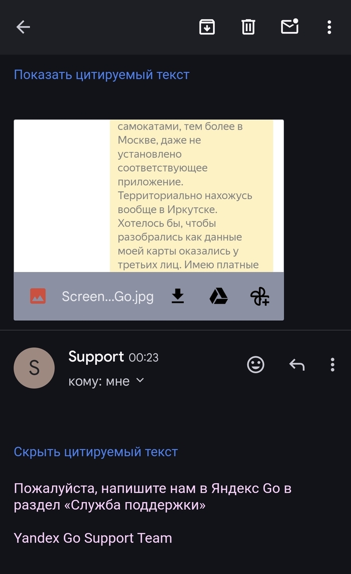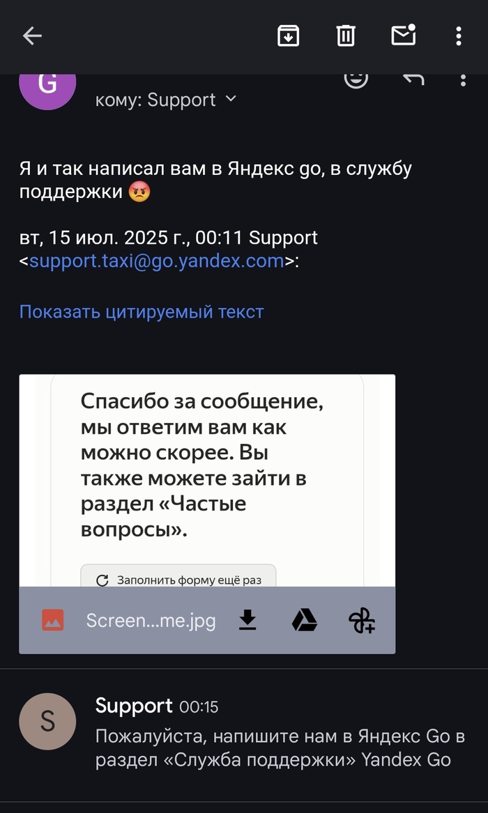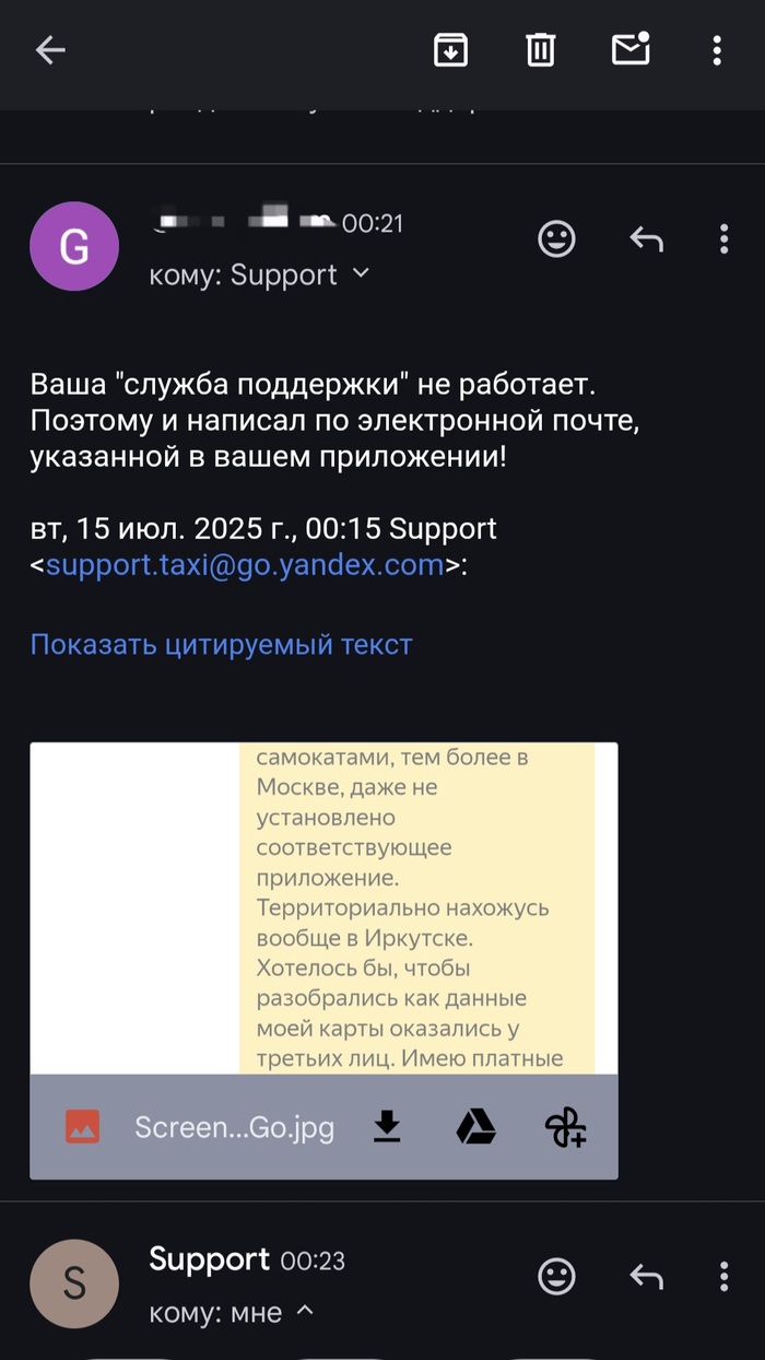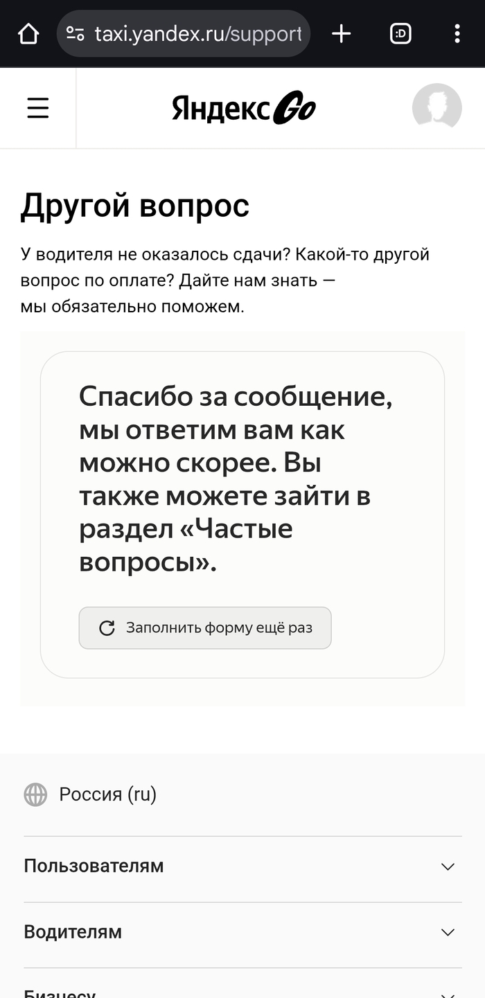 Бля, я написал в поддержку Яндекс go через обращения обратной связи. Сообщил support.taxi@go.yandex.com. Те, нихуя обращайтесь в чат. Я уже в чате дублирую текст обращения... И... Хуй! Обращение в чате не отправляется. Предлагают написать на support.taxi@go.yandex.com! Я опять туда же, говорю, ваш чат не работает. Они - обращайтесь в Яндекс go...
