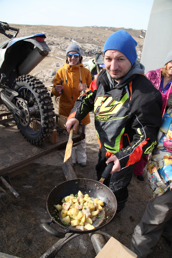 встреча! На огромной площади Малого Моря съемочная команда Red Bull выбрала именно это место, рядом с нашей стоянкой, для съемок ролика (который вы, наверное, уже видели) с Даниилом в главной роли. Добавили ощущений чашка свежезаваренного ароматного молотого кофе и горячие блинчики, приготовленные нашей хозяюшкой Натальей Яскиной прямо тут. В этот день мы свернули лагерь и отправились в бескрайние Тажеранские степи. Видимо, за прошедшие пару дней Дима убедился в нашей адекватности и, как только мы въехали в степи, предварительно оснастив нас рюкзаком с радиостанцией, разрешил нам с Тимофеем ехать на «квадре» куда вздумается. Местами лежал заиндевевший снег. На