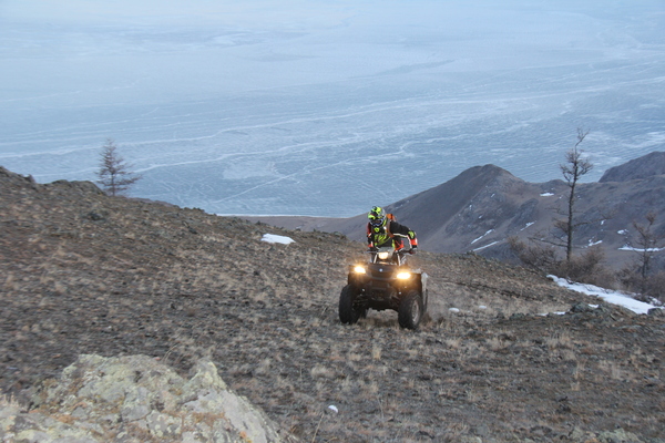 отставая секунд на 15. Нагнав наш квадроцикл в прямой видимости, обнаружили следующую картинку: Тимофей с Настей ухватились за багажник, передняя часть «квадра» под водой, задняя пара колес в воздухе. Ребята в темноте решили потихоньку переехать разлом, и «квадр» провалился, проломив лед. Ребята чудом успели спрыгнуть и подхватить повисшую на брюхе машину. Общими усилиями и с помощью «такой-то матери» мы всей командой смогли спасти «квадр». Настя, пока мы держали «квадр», отважно пробралась к кнопке