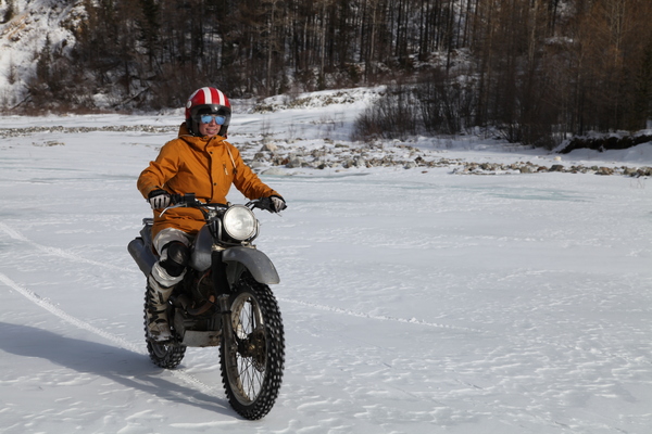 Точкой старта нашего ледового эндуро-дня стала река Белый Иркут на приграничной с Монголией территории, куда не попасть просто так: нужно миновать пару контрольных пунктов с пограничниками. До границы с Монголией — всего 15 километров. Если у вас собой не окажется паспорта, то, скорее всего, вас развернут. Однако мы были предупреждены, и проблем с проездом через КПП не возникло. Свернув с дороги под мост, Дима выбрал место для разгрузки, это и было нашей точкой старта. Круче всех, наверное, смогла бы описать свои ощущения Ольга, так как до этого момента она никогда не управляла мотоциклом, не трогалась и не переключала передач. И если нормальных людей этим навыкам обучают на ровных площадках, то у Ольги все как раз таки произошло в стиле «экшен». Дима приготовил для нее отличного «ишака» по имени Honda SL230, провел инструктаж, рассказал, куда жать и что крутить, — и спустя 20 минут она поехала сама. Дима, ты талант! Мы зашиповали мотоботы «колдкатерами» и выдвинулись всей командой. Мне досталась WR450, Эмиль ехал на Husaberg, Тимофей — на WR250, Володя сдружился с