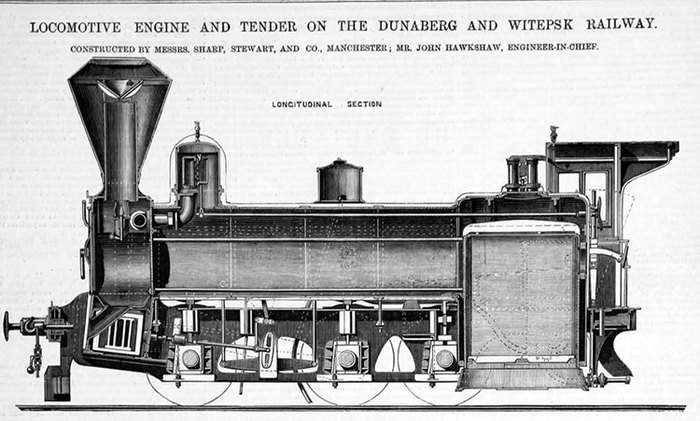 Динабурго-Витебскую железную дорогу начали строить в 1863 году англичане. Первый однопутный участок от Динабурга до Полоцка длиной в 151 версту был открыт для движения 24 мая (5 июня) 1866 года, а второй участок от Полоцка до Витебска — в октябре. В Англии же заказывались локомотивы и паровые водяные помпы для станций.