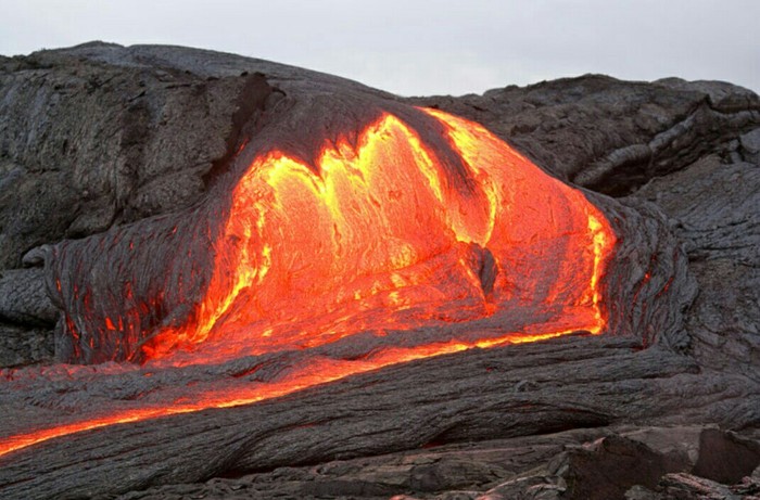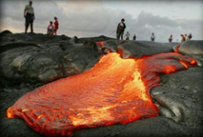 Извержения действующего вулкана Килауэа на острове Гавайи не так опасны .Здесь лава изливается как из жерла ,так и из нескольких открытых боковых кратеров огнедышащей горы .