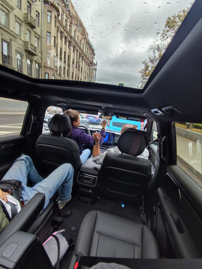 Второй ряд представляет собой два раздельных кресла с проходом между ними, что обеспечивает комфортный доступ к третьему ряду. Первые два ряда — с массажем, вентиляцией и подогревом; третий — урезанный, но все же комфортный.