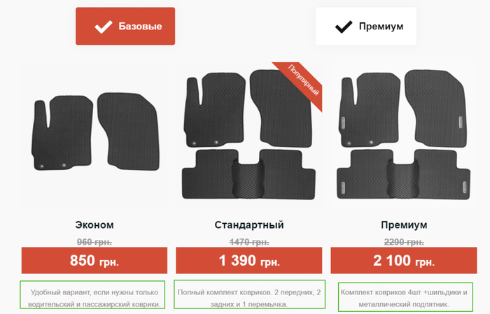 Чем отличаются коврики «Базовые» и «Премиум», сразу и не поймешь. Переключившись несколько раз, это становится понятно. Но лучше отличия (в рамочках) выделить, чтобы они обращали на себя внимание.