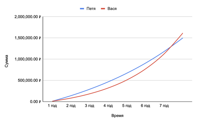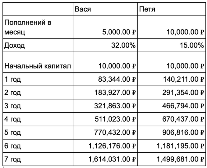 На этом месте можно задуматься, ведь доходность Васи в 2 раза больше и если в первый год Петя за счет пополнений и будет иметь больше денег, то на 2,3,4 года уже точно сложный процент сотворит свою магию.