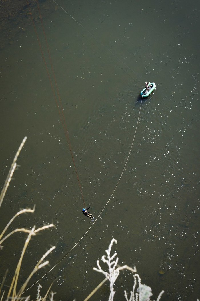 Пять секунд полета и эмоции на всю жизнь. В прыжке меня почему-то закрутило, что вызвало еще больший страх. Мне казалось, что я подгибаю под себя ноги и переворачиваюсь вниз головой, отчего ориентация потерялась полностью. Я не понимала, что происходит, куда я лечу и как далеко еще до низа. В реальности, посмотрев видео, я увидела, что летела как раз таки ногами вниз, потом меня перевернуло на спину и только под конец я "встала на ноги", большинство же ребят падали, распластавшись «звездой». В один из моментов меня действительно перекрутило и только тогда, выровнявшись и приняв позу «звезды», я смогла оглядеться вокруг и выдавить из себя какой-то выкрик. До этого в горле стоял не то ком, не то спазм. Болтаясь над водой на страховке, я огляделась вокруг: Господи, красиво-то как!!! Потом ко мне подплыл человек на лодке, мы сняли страховку и я вернулась на берег. Осознания, что только что произошло, не было. Даже руки больше не дрожали. Оно пришло позже, когда появились фотографии и видео. Боже, неужели я все-таки это сделала?! Страх по новой сковывает тело.