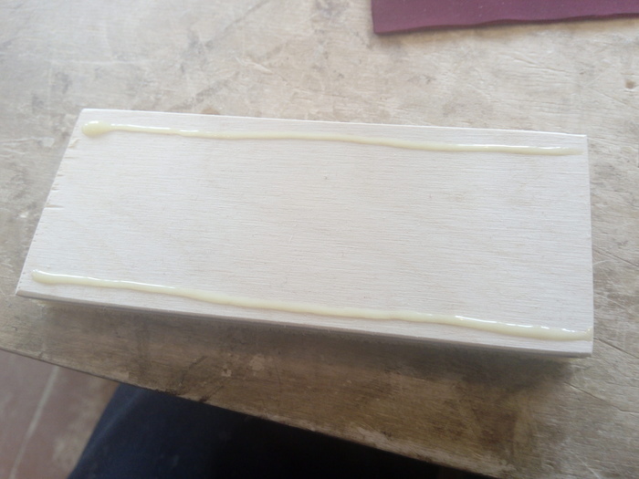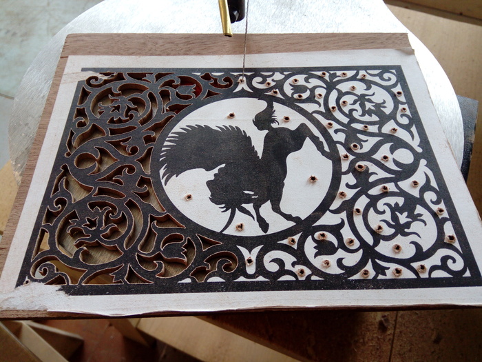 Счел это необходимым, дабы избежать светлых пятен при склейке. Так как рисунок большой, то избежать попадания клея на внутреннюю сторону рисунка крайне сложно. (а может и невозможно) После склейки рисунок внутри зашлифовать крайне сложно, а застывший клей не дает древесине взять масло или лак, в итоге получаются белые пятнышки. А вот если изначально промаслить, то пятен не будет. Следующее. Опять же столкнулся с проблемой. Рисунок большой и намазать его весь клеем не успеваю((( Клей успевает подсохнуть... Конечно для многих не новость, а вот для меня стало открытием, что клей можно нанести сначала на совершенно не нужную поверхность, потом приложить нашу выпиленную дощечку, и быстро снять. В итоге весь наш узор будет намазан клеем одновременно, и теперь можно клеить к заготовке. При склеивании дощечек, надо обратить внимание на направление волокон, дабы избежать последующей деформации. Волокна на дощечках должны идти перпендикулярно друг другу.