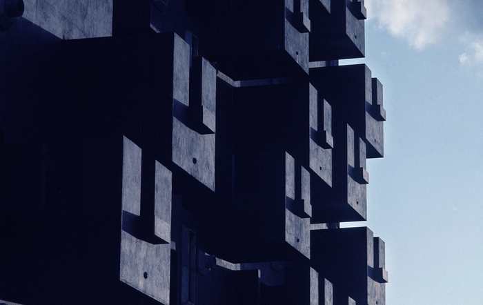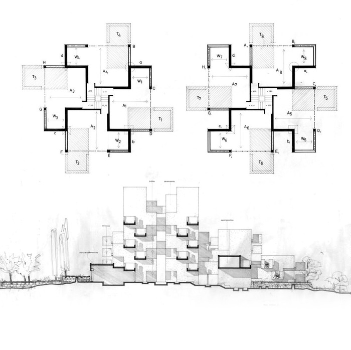 На площади в 4000 квадратных метров разместилось 90 квартир в виде кубов, которые сконцентрированы вокруг центрального ядра (лестничных колодцев). При этом одна сторона каждого куба соединяется с центральным лестничным ядром.