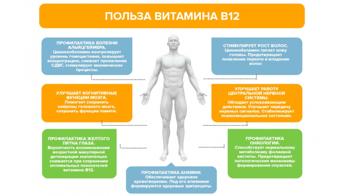 Для чего еще нужен витамин В12? Кобаламин помогает функционированию мозга, полезен для здоровья органов зрения, слуха и стенок артерий. Нутриент влияет на выработку гормона сна мелатонина и, следовательно, имеет значение для регулирования ритма сна и бодрствования. Вещество отвечает за торможение процессов возбуждения в нервной системе, что выражается в успокоительном эффекте.