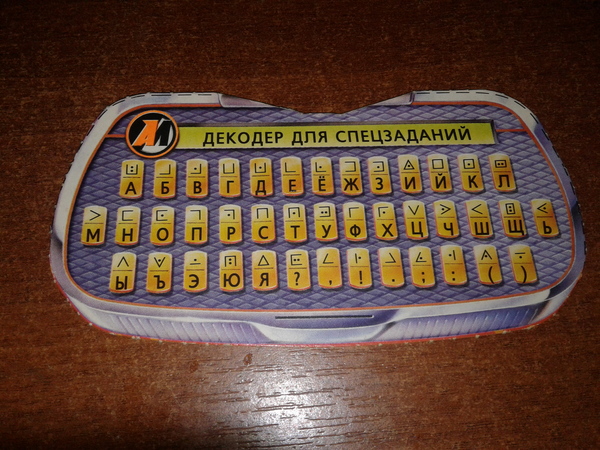А вот на картонной упаковке обеда была радость многих школьников - готовый шифр для игр. К нему прилагались несколько шифров для дешифровки, но они у меня не сохранились. В школе, где я училась, тоже ну очень многие им пользовались. Этот декодер ниже - до сих пор на почетном месте - в моем старом блокнотике с кодами к многим компьютерным играм того поколения.