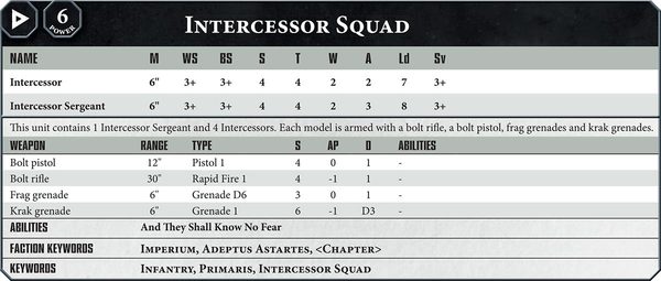 Как вы видите, они довольно похожи на классических космодесантников: спас-бросок на 3+, болтеры (слегка улучшенные) и обычные фраг-/крак-гранаты. Но есть и значимые отличия.