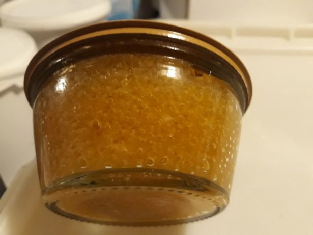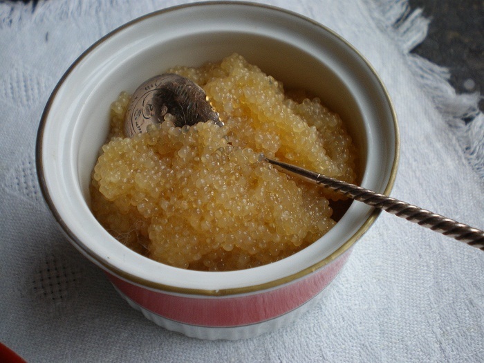 Деликатес перекладывают в баночку, стенки которой смазаны растительным или оливковым маслом. Чтобы икринки были рассыпчатыми, масло (не более ½ чайной ложки) добавляют и в саму икру.