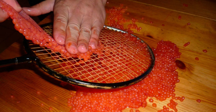 В нашем же случае следует аккуратно разорвать пленки и не менее аккуратно пропустить икринки сквозь сито, ячейки которого не меньше, чем размер самих икринок.