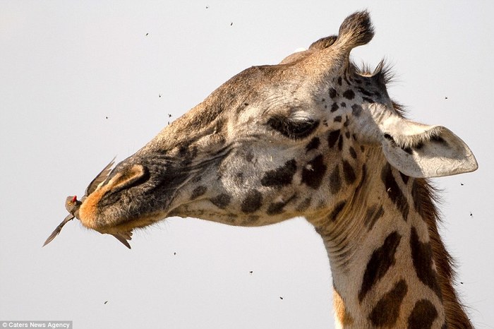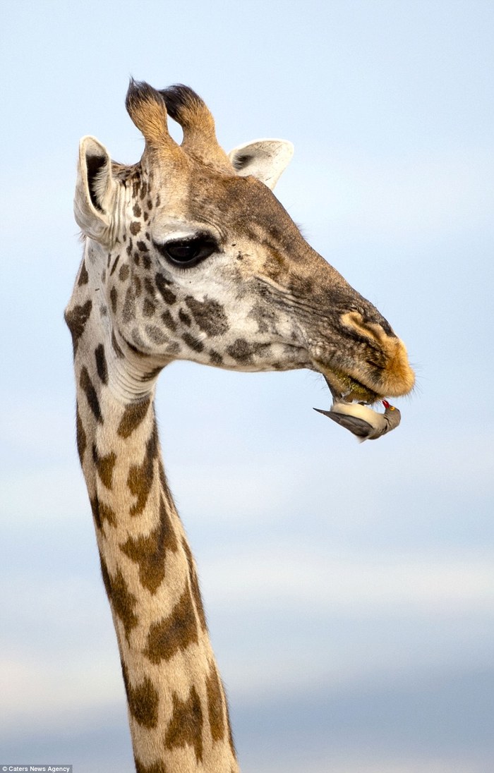 Красноклювые буйволовые скворцы питаются остатками пищи, которые застряли между зубов жирафа в Танзании.