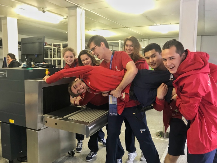 Но внутри этих полутора тысяч есть обособленная группа, которая не имеет ротаций — все матчи работает на своей позиции. Это волонтеры камер хранения — павильоны перед входом на стадион, куда нужно сдавать негабаритные и опасные вещи с которыми не пускают на стадион. Именно в этот отряд мы и попали.