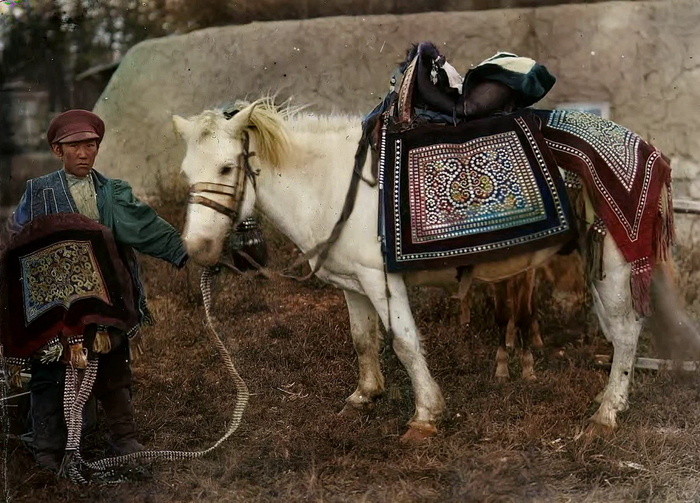 Лошадь в праздничной сбруе и наездник в торжественной одежде.