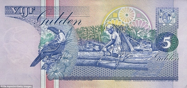 На банкноте номиналом 5 суринамских гульденов образца 1991 года изображены тукан и лесоруб.