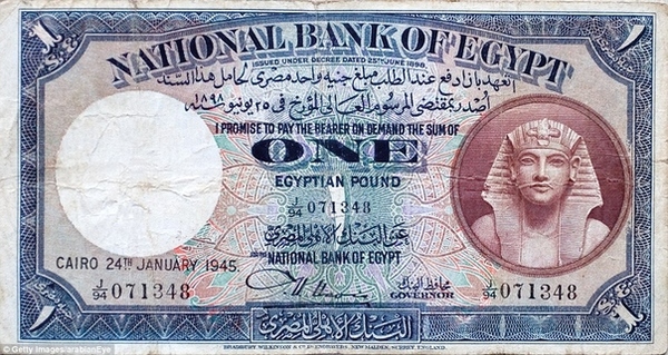 Купюру номиналом 1 египетский фунт образца 1945 года украшает портрет фараона Тутанхамона.
