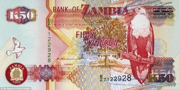 Орёл и голубь на банкноте номиналом 50 замбийских квач образца 1992 года.