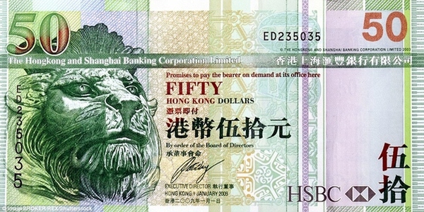Изумрудный лев на денежной купюре номиналом 50 гонконгских долларов.