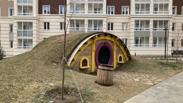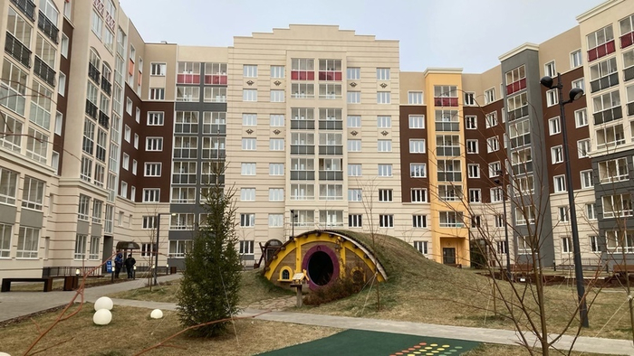 В новом доме все красиво. Стеклянная подъездная дверь, красивая отделка в подъезде.