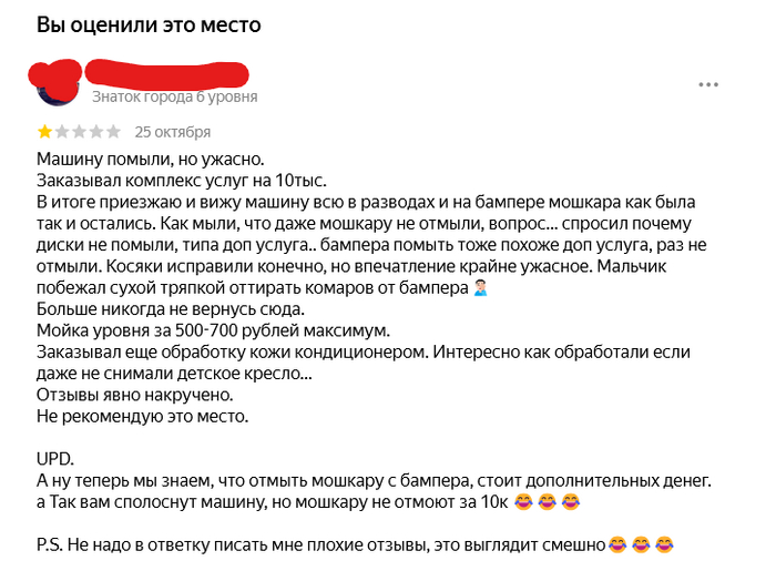 Когда приехал домой, оставил соответствующий отзыв на автомойку и забыл про эту ситуацию.