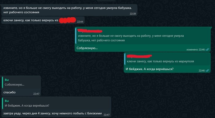 Работала у меня сотрудница, пусть будет Алиса (на манеру Яндекса). Вопросов особо и проблем не было. Алису всегда забирал молодой человек. Имени его не знаю, так как личные вопросы сотрудников меня не интересуют. В один момент Алиса уволилась. Увольнение прошло вполне спокойно и без конфликтов.